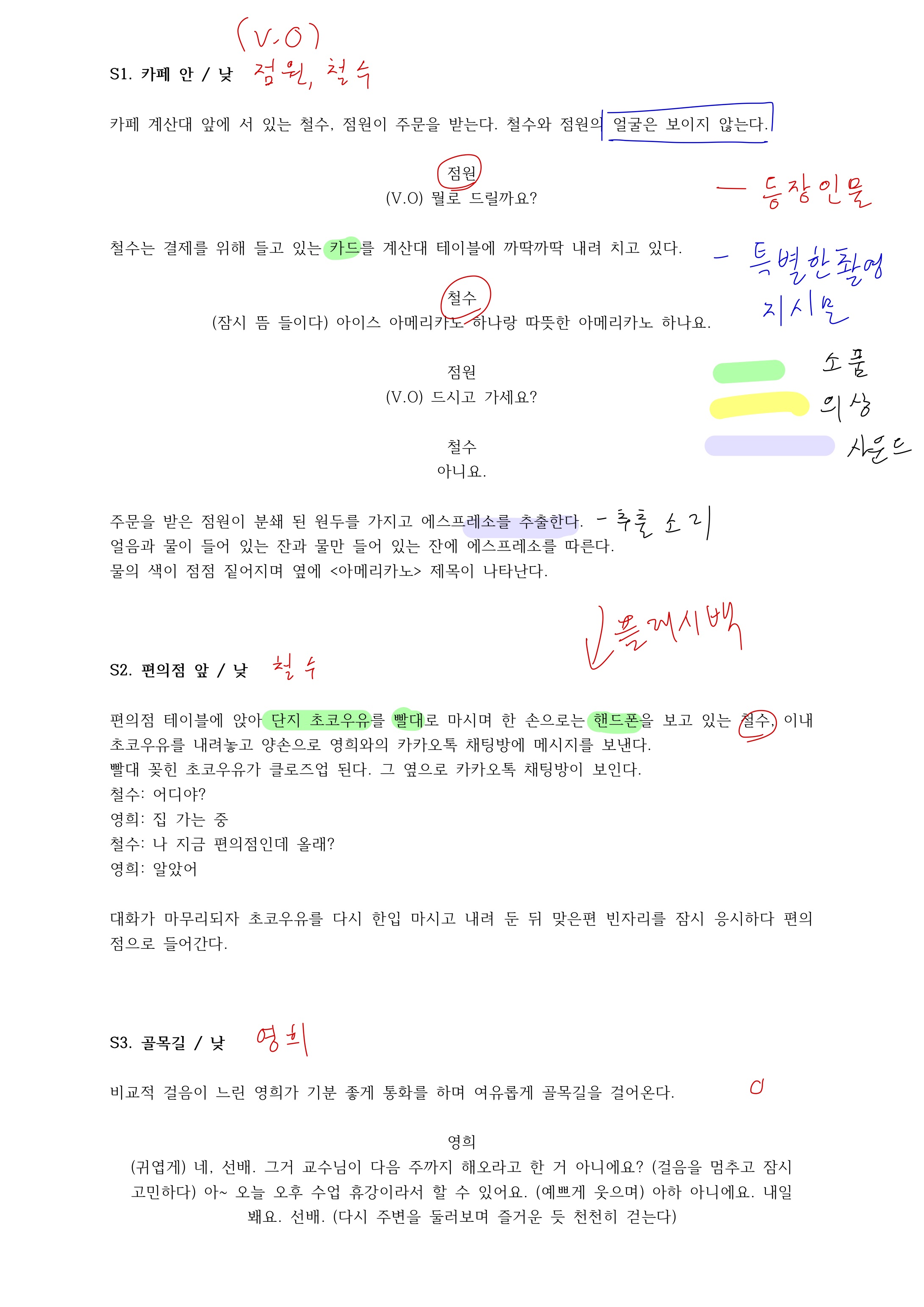 2. 목소리만 나온다던가, 카메라의 움직임이 명시되어있는 부분은 파란펜으로 특별촬영지시문