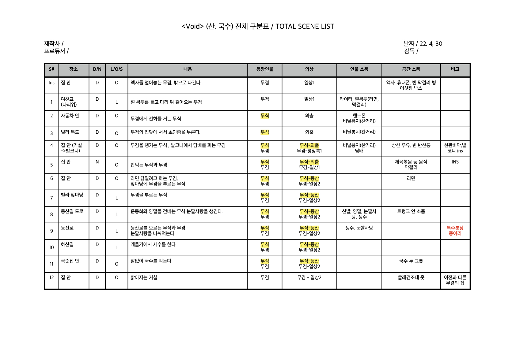 장편같은 경우는, 씬별 소품리스트, 씬별 의상리스트, 씬별 등장인물표 이런식으로 다 만들지만 단편에선 씬리스트 하나로 퉁치는 편이 많은 듯 합니다.